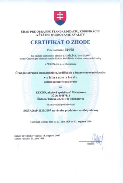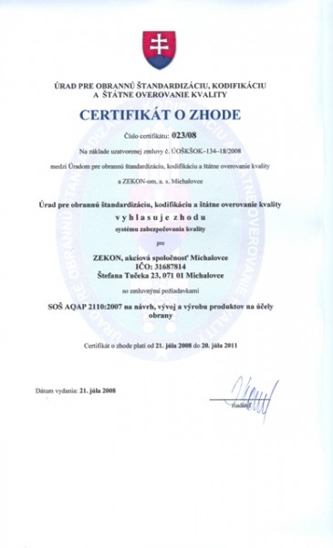 Dňa 31. júla 2008 sa v akciovej spoločnosti ZEKON, a.s. Michalovce uskutočnilo slávnostné odovzdanie certifikátu zhody systému zabezpečovania kvality podľa SOŠ AQAP 2110 : 2007 a SOŠ AQAP 2120 : 2007