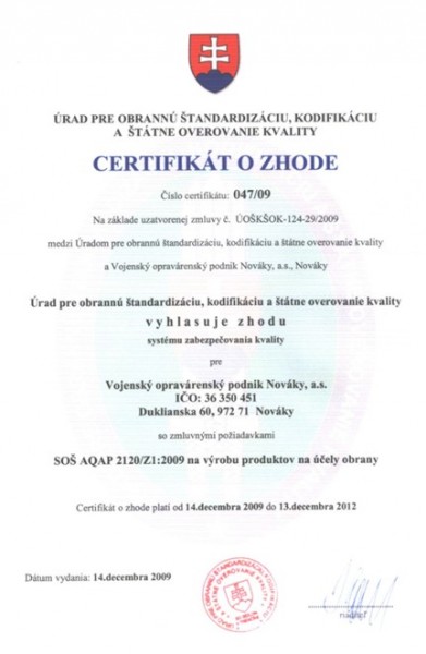 Dňa 9. januára 2010 riaditeľ Úradu pre obrannú štandardizáciu, kodifikáciu a štátne overovanie kvality Ing. Emil KOŠÚT slávnostne odovzdal certifikát o zhode systému zabezpečovania kvality podľa SOŠ AQAP 2120:2009 spoločnosti Vojenský opravárenský podnik Nováky, a. s. Pre viac informácii kliknite TU. |
