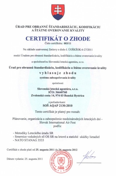 Dňa 27. augusta 2011 riaditeľ Úradu pre obrannú štandardizáciu, kodifikáciu a štátne overovanie kvality RNDr. Slavomír KUBO slávnostne odovzdal Certifikát o zhode systému zabezpečovania kvality podľa SOŠ AQAP 2130 spoločnosti Slovenská letecká agentúra, spol. s r.o. Banská Bystrica, ktorá organizovala tohtoročné medzinárodné letecké dni SIAF 2011 na letisku Sliač. Certifikát si prevzal riaditeľ Slovenskej leteckej agentúry a súčasne aj riaditeľ medzinárodných leteckých dní SIAF 2011 pán Hubert ŠTOKSA.